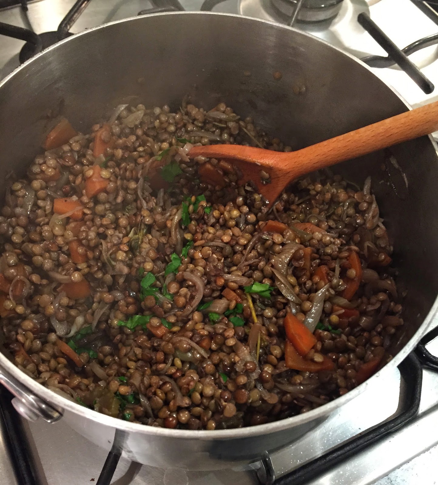 About 45 minutes before the pork is ready, you need to prepare the lentils and the herb sauce. For the lentils cut all the vegetables and make the stock. Then add 2 tablespoons of olive oil to a large saucepan and gently cook the vegetables, garlic and thyme until just soft (about 10 minutes).