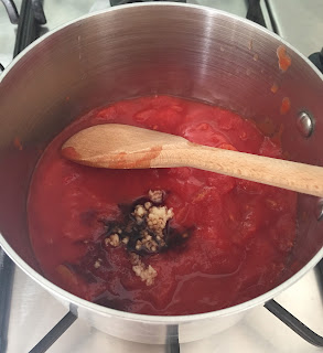 To make the tomato sauce, mix the tomatoes, a crushed garlic clove, a tablespoon of balsamic vinegar and a pinch of sugar in a saucepan and bring to the boil.