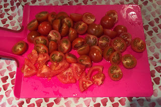 Add the cherry tomato halves with the bay leaves. Halve and add the chilli (if using) and then add the leaves of the herbs. As I mentioned I just used dry herbs, probably not as good but I didn't want to buy some and then end up throwing most of them away. Season and toss well, then place the pan in the preheated oven for 20 minutes.
